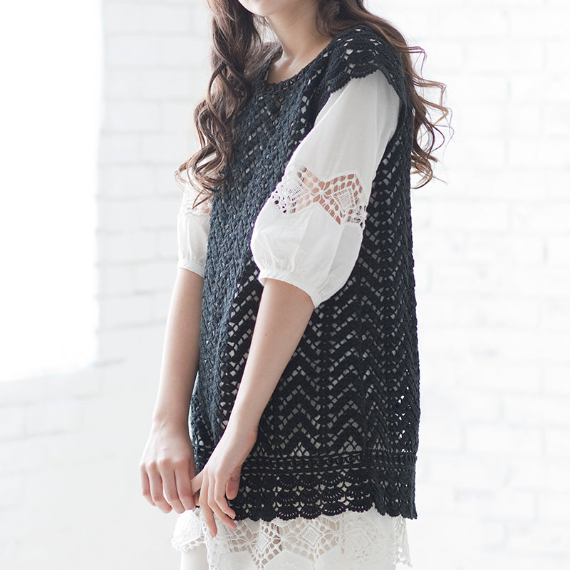 黒いチュニックは大きなジグザグの透かし模様が効果的。長さがあるので、模様の美しさがよく映えます。小さなキャップスリーブと裾のスカラップがお気に入り。春夏はレースのコーディネートで妖精みたい。秋冬はグレーのセットで落ちついた印象です。