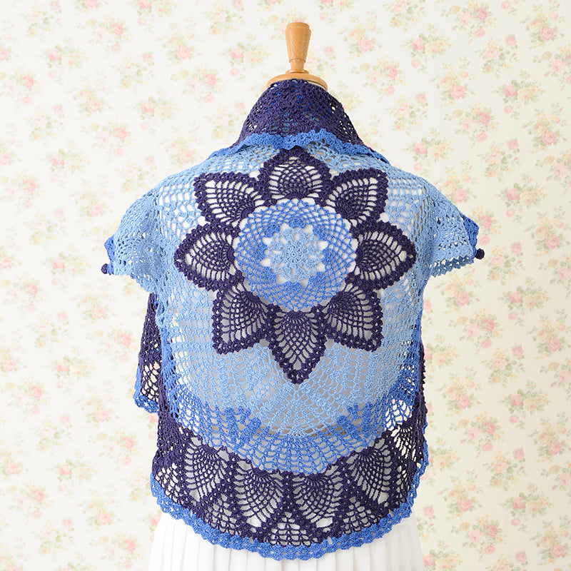 背中の中心からグルグルと編んでいくパイナップル模様のボレロ。ブルー系のグラデーションがフレッシュに映ります。小さなキャップスリーブには編みボタンを飾りました。