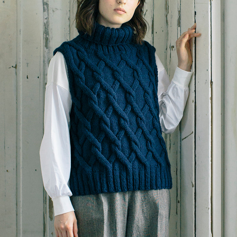 大きな交差模様が目を引くベスト。たっぷりのタートルネックと前後差をつけた身頃のスリットがスタイリッシュな印象。極太ウールで編みやすいです。