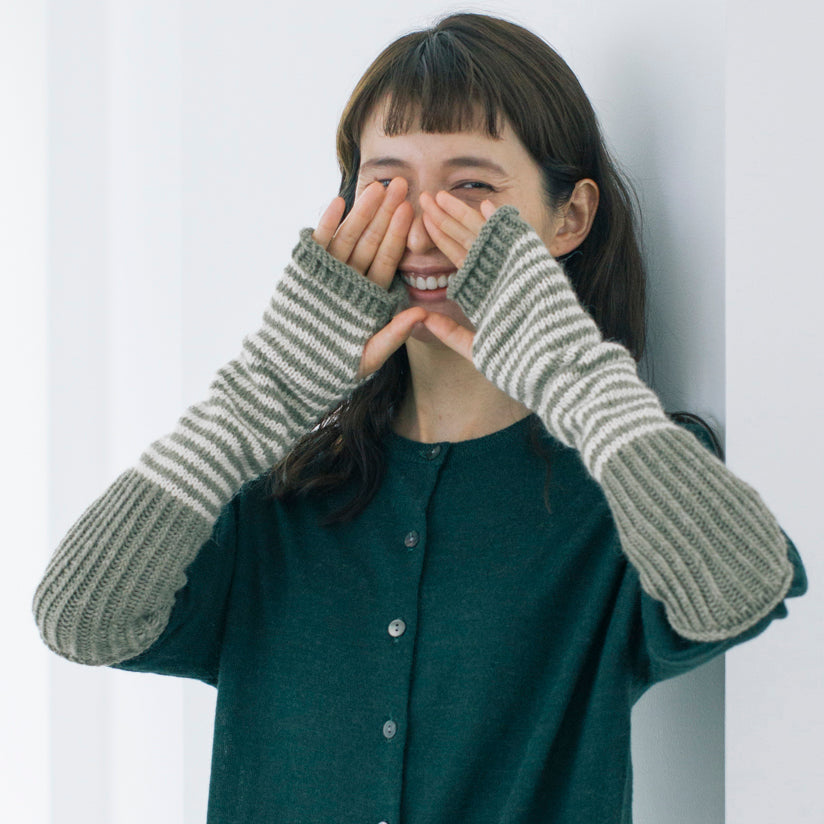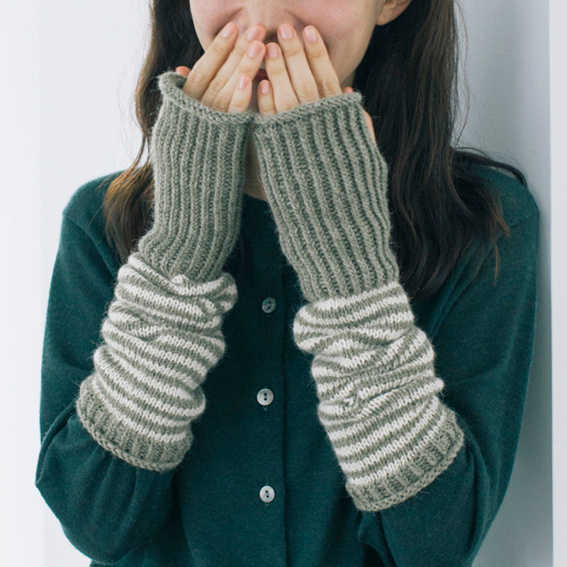 裏目をねじって編むねじりゴム編みで縦ラインを強調。ボーダーと組み合わせて、上下逆にもつけられるように。親指穴は往復で、それ以外は輪で編みます。