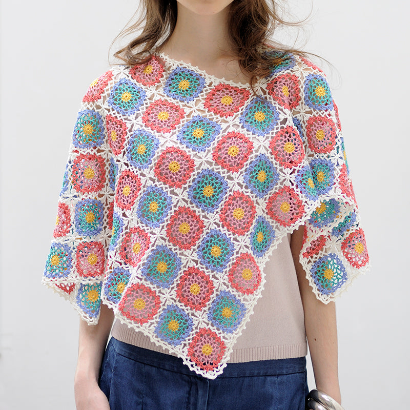 上質なコットンで編むサマーポンチョはブルーとピンクのモチーフを白でまとめてキリッと爽やかな印象。衿ぐりをタテ、ヨコ、ナナメと身頃をまわして、色々な着こなしが楽しめます。